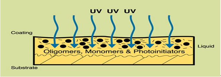 UV固化的原理:UV照射于UV涂料上,涂料中的引發(fā)劑吸收UV能量,引發(fā)UV樹脂反應(yīng),完成涂膜由液相到固相的轉(zhuǎn)變,固化完成。而它具有的硬化速度快、綠色環(huán)保等特點(diǎn),使得紫外線固化工藝成為了家具廠、印刷廠等企業(yè)的首選生產(chǎn)方案。